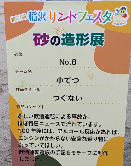 おはようございます愛知県稲沢市 木曽三川公園 サリオパーク祖父江での砂像の 残りをアップいたします昨日はいきなり 残酷な像の説明をしまして 申し訳ございませんでした残りの砂像 アップいたします説明正面 スフィンクス裏面 宇宙ですね説明正面 隣の市 一宮市は モーニングの発祥と言われています余りにもリアルで 大きくしてみました説明正面 深海魚と女神でしょうか裏面です 説明正面 稲沢操車場がありました 今でも一部 残されています裏面です説明正面裏面説明正面裏面説明正面裏面両横面にも 色々と工夫されて 絵柄が ありますが全て 割愛しましたこれが11月3日から 壊される 勿体ない 気がしました