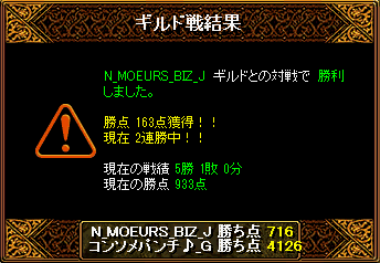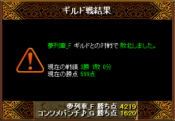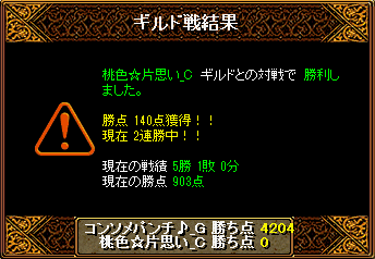 アリーナGv、相手は桃色☆片思いさん。参加人数15人。結果3LA0死。久々に火力できた気がする。Gv前は恒例のログイン鯖過負荷。ログイン鯖との戦いに負けて出れない人多数…それでも火力以外は割りと参加良好、火力は2枚だったけど…しかもWIZさんの準備時間がなくてヘイスト足りず4フレ。逆に相手は火力大目の支援妨害少なめだった感。妨害の人数差に任せて腕檻や足止め、真空からタゲ合わせて何とか。後はスイッチで装備外れたっぽい人もか。こういうの見るとスイッチの恐ろしさが分かりますね…相手方もログイン障害だったのか分かりませんが、(ログイン鯖だとすると多分全鯖が障害だとは思う)今度は障害が起きてない時に戦いたいです。それではまたー。