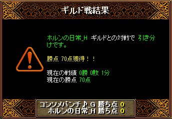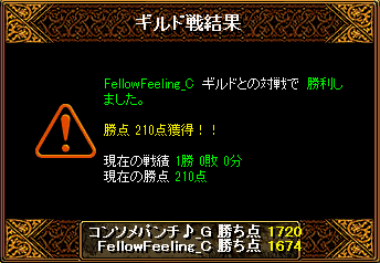 アリーナGv、相手はFellowFeelingさん。参加人数15人。結果0LA0死。前半で相手に先制され、追加点も取られてお通夜ムード。が、途中で相手の同じPTの2天使をどっちも腕してからの腕檻真空で倒せて1人差。後半に孤立した霊術を捕まえて総タゲで落として倒した人のLv差で逆転。そのままタイムアップでなんとか勝利。ずっと緊張しっぱなしで精神的に疲れるGvでした。でも楽しかった!FellowFeelingさんとはいつもこんな感じでいい勝負なのがいいですね。それではまたー。