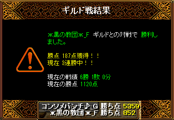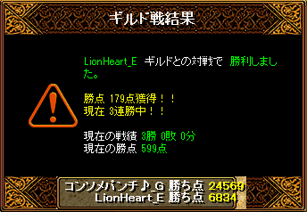 アリーナGv、相手はLionHeartさん。コンソメが苦手なギルドさんですね。ここ数戦負けっぱなしだった気がします。参加人数19人。結果6LA1死。一言で言えばノーガード殴り合い。戦い方が昔に戻ったような感じでした。すっごい楽しかった。WIZと天使にはすごく大変なんだろうなぁ…得点シーンは相手がかなり突っ込んできてたのでそこに腕檻や胴入れてからのタゲ集中と引っ張れる人を引っ張ってタゲ集中がメイン。あ、私は夢中になって攻撃してたら足止めも腕檻ももらってないのに普通に死にました。どうも、コンソメのPPことNissyです。それではまたー。
