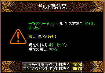 アリーナGv、相手は一杯のラーメンさん。参加人数15人。結果0LA2死。なんという足手まとい感。火力なのに…脳筋なのでガンガン突っ込んでたら序盤からすぐに腕檻のタゲにされました。これ以上硬くするのもなかなか難しいし…剣士だからって突っ込むのはやめたほうがいいのか…Gvとしては勝ったけど個人としては完全に負けた気分。悔しい。それではまたー。