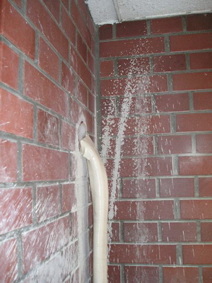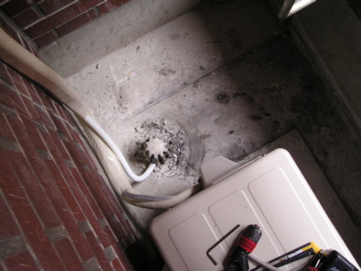 コンクリートに穴を開けると細かい粉が出ます。其れが嫌なのでペットボトルで水をかけながらあけます。そうするとこういう風になります。噴霧器とブラシを使って壁を磨いて綺麗にします。中はこんな風に苦労しました。丁度穴の中につなぎの部分が来てしまいます。人手が有ればひとりが支えている間につなぐのですが、だ~れも都合が付きませんでした。そこで脚立と水道屋さんの段ボール箱に支えて貰いました。何とか上手くいきました。