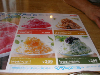 私の大好物です。金時が大好きなのですが、この頃はどこへ行っても宇治金時になります。以前は良く宇治抜きにして貰ったのですが此所では、宇治シロップで宇治を抜くとシロップ抜きになるので、作れません。其処で宇治を食べれるようになりました。其処で一里野音楽祭の会場で食べたかったのですが、小さくて300円オマケに金時はないので、はるばる金沢市内まで我慢して走ってきました。本格的なかき氷は今年初めてです。値段もどれでも299円これを食べるとほてった身体の温度が下がります。そしてOさんはいちご私は宇治金時を注文しました。
