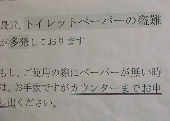 使用の際にペーパーがないときはお手数ですがカウンターまでお申し出ください。と有りますが、まず急ぎの際は紙のあるなしなどを確かめずにしてしまうモノです。実は何を隠そうこの私も事を為した後で無いのに気が付いて困ったことが2度ほどありました。どうしたのかは企業秘密です。それでも、どうしても知りたい方はメールにて!!