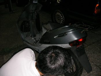 確か2年ほど前には動いていたと思いますが、この頃は乗ってませんでしたし、ナンバーも去年外しました。ご存じ素人のOさんが今日はスクーターを動かします。先生はいつものこの私です。実は昨日少しやってみたのですが、夜暗かったので今日に繰り延べです。夕方少し涼しくなりましたのでスタートします。まずバルカンからガソリンを少し抜きます。其れをスクーターに入れました。バッテリーはしっかりと上がってますのでキックを何回かしたのですが応答はない。今度はキャブレターの古いガソリンを抜きましたが、何にも出てきません。次にエアクリーナーを外し指でチョーキング、レーシングカートを思い出します。一寸だけ応答がありましたがダメでした。さあ仕方ないのでプラグを外します。さてどこにあるのやら、足下のパネルを外したいのですが、前を外さないと外れません。前を全部外したら、其処は全然関係ないのがやっと分かりました。ケツのしたのメット入れの部分を全部コッポリと外しました。此所にエンジンがありました。これはホンダですが、ヤマハとは位置が大分違います。プラグを見てみると汚いというモノではありませんでした。ごっぺりとゴミやら煤やらが付いてます。プラグ交換、プラグの新品買い出しです。使用前史用語は随分と違います。そしてプラグを交換してキック、チョーキング、ボボボボボボ~かかった。そのままエアークリーナーを取り付け、車体を元に戻すが素人さんはどのネジがどこにあったか等は殆ど覚えていない。私は一切手は下してません。出すのは口だけです。まあ多少のすったもんだと大声の激励は有りましたが形は元に戻りました。テスト走行、走るのには走ったが、前輪のブレーキをかけるが戻ってこない。前輪ブレーキの修理は又の心だ!!