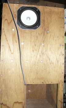 まず入門用に10cm一発をお奨めしたいです。ネットワークのない分だけ音が良く値段も安い。いい音に対してだけにお金を使う。音を目で見るのではなく耳で聞くのです。車では13cmで聞いていて8cmでいい音が出るのかと云うことですが、スピーカーの命はまず箱です。その次にスピーカーユニットなのです。箱が大きければ能率が高くなり大きな音が小さなW数で無理なく出ます。一般的には能率の悪い、重い反応の悪いスピーカーユニット、ネットワークを使ってますので、ものすごく大きいW数が必要です。能率の良い反応の良いスピーカーの音は別世界です。しかし今貴男の周りにある普通のスピーカーは反応の悪いスピーカーです。今作ろうとしているスピーカーの少なくとも倍はW数を食います。例えば100Wのスピーカーというのは100Wの大きな音で鳴るというのではなく、100W入れても壊れませんよと言うことなのです。コーン紙を重くネットワークに抵抗を入れて動きを悪くしています。その方が売れるのです。メーカーは良いモノよりも売れるものを作ります。そして大多数の消費者に合わせたレベルのモノを作ります。自作スピーカーはそれに反してます。メーカーは儲かりにくいです。メーカー製が有れば作る必要はありません。スピーカー自作のもっとも大きなメリットはペットボトルに入れても、段ボール箱に入れても箱造りに失敗しても兎に角音が出ることです。これは大変有りがたいことです。アンプの自作はしたこともありませんししようとも思いませんが、まず失敗して音が出ません。部品を壊したり、燃やしたりする可能性が大です。箱作りは素人が手を出しやすいモノだから嬉しいのです。又奥も深いですがね。これは私が作ったバックロードホーンです。長岡鉄男氏設計で10cm一発の15mm厚のサブロク1,5枚使用です。サイズは57×32×27,5cmですが黒い矢印のようにくねくね曲がって後ろに行ってUターンして音道が3メートルにも成ります。こんなに永井ホーンを形成してます、凄いでしょう。ボックスに穴を開けてターミナルを着けると、ターミナル代金がかかり尚かつ音質劣化を推進することになります。ですからコードはこの音道を通ってます。
