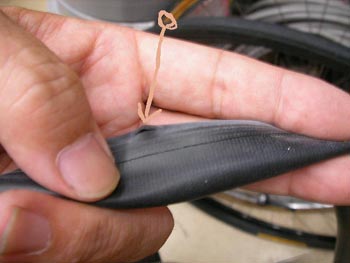 え~、時節柄、又年齢的に健康志向の折り、健康法としての自転車の事を書こうと思います。丁度9/21日の朝伊勢原にて12キロのトレーニングを終えた後、Leadcoreさんの乗ってた白い方のロードレーサーの前輪が、ぷシューとエアーが抜けたのでした。Leadcoreさんは一寸びっくりしたようでしたが、私は途中でパンクしないで良かったと思いました。さっき開けてみると、こんなんになってました。チューブにスポークで穴が開かないようにプラスチックのカバーが付いているのですが、その引っ込んだディンプルのところに穴が開いたのです。何か変ですが仕方有りません。何か考えて対策をします。パンクしたのは直径22,7mmのWOと言いますが普通の仕組みのタイヤです。もう一方は一番下の写真のようにまん丸になっていて中にチューブが入っています。こいつは少し太くて24mmです。どちらのタイプが細いと云うことはないのですが、それぞれいろんなサイズがあります。勿論パンク修理も出来ますがカッターで糸を切ってチューブを直して又糸で縫うのです。このようなタイヤをチューブラーと言います。私はこっちの方が好きです。下から三枚目のようなケースに入れて携帯します。そして空気入れさえ持っていればタイヤを交換して帰って来れます。一方普通のタイプは空気入れだけでは駄目で新品のチューブとタイヤレバー桃って居なければいけません其れとタイヤが凄く細いので、タイヤの耳でチューブをはさんで失敗してしまう可能性が大です。チューブラーはホイールにボンドのようなモノで貼り付けてあるので、工具は要りません。ですからそれぞれホイールの形も違います。ああそれから此がフレンチバルブです。仏式。