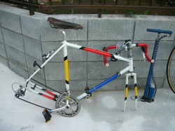ロードレーサーについても思いこみや迷信のようなモノが沢山あります。本当にそのものをより理解したいのなら、頭の中をオールクリアに下法が良いのですが中々難しく要らないものが残ってしまい邪魔をしています。さて今回は普通の自転車のことも少し話します。サスペンションはタイヤだけだと思っていらっしゃいますが其れは大きな間違いです。そう思って居るので、タイヤの空気圧を規定より少なく入れてあるのです。普通の自転車の空気圧は3,5キロです。(普通の乗用車だと約2キロです)此はタイヤにも書いてありますが、まずそんなにはいれてありません。だから良くパンクするのです。空気圧が少ないと釘をひらう可能性が高くなります。規定の空気圧が入っていると釘があってもはねとばすようになってパンクが飛躍的に少なくなります。さて、それなら自転車のサスペンションはどこにあるのでしょう。まずはタイヤとリムとスポークです。厳密に言うと一体型のプラスチックのホイールは乗り心地がわるいと云うことです。然しコストを考えるとプラスチックの方が安くなるでしょう。その次にホーク、フレームです。私が折りたたみを嫌うのは其処なのです。折りたたみにするとフレームの強度やサスペンション効果が非常にわるくなります。殆どは強度不足か重量が随分重くなります。その辺りが満足できる折りたたみは10万はします。自転車にとって重量は非常に大事です。車と違い非力なエンジンで動かすからです。そのほかサドルですが此所にはかなりの重量が掛かります。話は戻って60キロの体重の人で40キロも掛かります。一寸此所でロードレーサーとの比較ですが、ロードならサドルにはその半分の20キロです。根本的にサドルに掛かる重量は倍も違うのですから、形も性能も全く違うモノになります。後の20キロはハンドルで日本の手に分散されて片手が10キロです。理想的なロードレーサーは手に10キロ、足にも10キロお尻には20キロと重量が理想的に分散されて実は一番楽なのです。ですから腰の悪い人は、普通の自転車に乗ると40キロが係腰には良くありませんロードの方が負担が半分なのですが、思いこみや迷信でロードのように腰を曲げると腰に悪いと思ってしまうのです。然し現実はフレームサイズが大きすぎるモノが沢山売られていますので腰に悪いケースもかなり多いのですが。トップチューブの長さ(サドルからハンドルまでの距離)は長すぎると手に10キロ以上掛かってしまい腰に負担が掛かります。短すぎると普通の自転車のようにサドルに40キロも掛かってしまい又此も腰には悪いです。フレームのサイズは此所が問題なのです。多少ならステムの長さや、サドルを前後させて調節は出来ますが、根本的にフレームのサイズが合わなければ難しいです。足の長さについてはサドルを上げ下げすることでそんなに難しくありません。話はサスペンションに戻ります。以上のことでサドルには40キロも掛かるので大きく柔らかいサドルが好まれますが・・・・未だあります。人間がサスペンションの役目も果たしているのです。もう一度云います。タイヤとリム、スポーク、ホークフレーム、サドル、そして人間、すべてが一体化して分散してショックを吸収し合っているのです。協力しています。たいやの空気圧が少ないとそのバランスが崩れるばかりか、パンクしやすくなったり、そのほかの所に逆に負担が掛かってしまいます。感覚的にはポンポコポンニ入れてもらえれば丁度いいくらいです。一般的ですが細いモノは高圧、太いモノは低圧なのです。