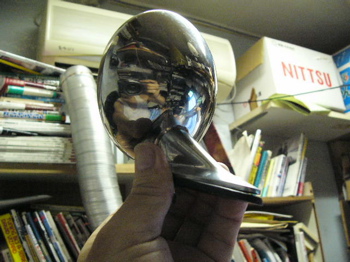 今日は久々に37,8℃もあります。さて私が若いときに初代スカイライン2000GTを乗っておりましたが、実は本当はホンダS800が欲しかったのです、そのころなら35万円でかなり程度の良いのも手に入りました。然し今ならかなり程度の悪いモノでも下手をすると200万はすると思います。こちらから求めていくと高くなる向こうから買ってくれと来ると安kなると言う法則がありまして、何十年も待っているのですが未だ来ません。スカイラインも向こうから来たので13万円でした。初めて買った外車のボルボアマゾンも50万円、二台目のボルボ164は当時クラウンの三倍の300万円もしたのに、向こうから来たので12万円でした。三台目のボルボ7406気筒ターボディーゼルはこちらから行ったので300万円もしました。これは6年モノで、アメリカから来たのです。三年車検がとれたのですが、3年しか乗ってません。一年100万、高いですね。これ未だ置いてあります。随分前置きが長くなりましたが、新品のS800のフェンダーミラーです。私のモノです。これは純正ではありません。一寸不思議ですがイタリア製です。バックに色々写ってますが、私のオークションルームです。主にバイクの本や車の本を売ってますので雑多なバックヤードです。最後の写真にはカメラと私の顔の一部が写っています。今回の日記は私の頭に中のような内容でした題名は本当は雑多でした。雑多王子より