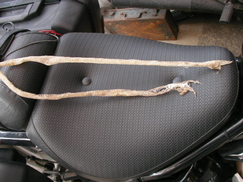 今日は寒いので半袖にダウンベストを奢りました。一時にめがけて歯医者へ行きました。2時からです。仕方がないので時間つぶしにいつものスポーツ用品店に行きました。この写真の後輪がやはりへこんでますね。ここから道へ出て右へ曲がるとケツがグニュッと振られて慌てました。少し走ったのですが何か変です。パンクです。数百m行ったところにバイク屋が有るのでそのまま乗って行きました。すぐにしてもらえました。なかなか愛想の良い店です。チューブも有り大型やりにくい料金で4000円でした。新しく出来た100円寿司に行こうかなと思っていたのですがこれでやめです。タッピングビスが刺さってました。次に不在者投票をしに行きました。二人だけでしたがしばらく待たされました。時計に上が張ってあり見えなくなっていました。ほかのところでなんでやと聞くと、お役所仕事で一秒でも早くても遅くても無効と成るのだと言う。片や投票率を上げるために宣伝カーが出ている。せっかく行っても一秒遅いとシャットアウトです。何をか言わんやです。さてやっともう一度、歯医者へ向かいます。5時に入れました。4時間かかりました。やっと来たのに5時の予約の人が来たら待っていただくことに成りますそれでもいいですかと言われた。結局その方が遅れたので早めに入ることが出来た。デジカメで歯を撮って説明をする。前はどうだったかな~、忘れました。レントゲンも2枚撮りました。私はあまり歯医者は好きでは有りませんが歯の詰め物を食べてしまったようなので、食べカスがその歯に引っかかり具合が悪いので仕方有りません。後何回か通う事に成りました。