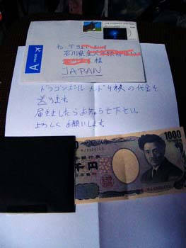 丁度、一週間前にドラゴンボールのカードを送りました。向こうからもこの手紙を送ったのです。途中でなくなってしまわないかと心配でした。1000円札がベルギーから里帰りです。お帰り、野口英世、遠い所から大変だったねー!!まさかベルギーの人とは思いませんでした。日本人だろうと思ってました。または奥さんが日本人だろうと。しかしこれはどうも本物です。数字なお書き方は外人特有のものですが、漢字は家の嫁に私より上手いと言われてしまいました。後はこちらからの手紙が着いたかどうかです。