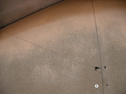 幅270cm高さ135cmの約一坪くらいの大きさのモルタル壁です。かなりの重さが有ります。左の方はなんとか工夫すればジャッキが掛かるかもしれませんが右の方は小ひさしの上に乗ってますのでジャッキは無理です。その上屋根の上ですから、もし崩壊すればかなりの被害が瓦に及びます。プロに頼めばなんやかんやで50万は掛かるでしょう。瓦を壊してしまえばもっと掛かるはずです。そこで貧乏なでんきやはなんとか工夫をして自力で直さなくてはなりません。ビスを使って引き寄せたいのですが、普通は12cmくらいまでしかありません。18cmくらいのが欲しいので、ホームセンターに探しに行きました。あっちこっち探しましたが見当たりません。駄目元で聞いてみると18cmのが有りました。頭の形が十字ではありません。四角です。こんなのは初めて使います。14cm程も壊さずに移動させなければなりません。外側が大きくて穴が小さいワッシャーを入れて18cmの特殊な頭四角ビスでモルタル壁を家の方にインパクトで少しずつ引き寄せます。屋根の上の脚立は恐いですが、足の長さがそれぞれに可変出来るのでこう言う場所ではなんとかOKです。こんな感じです。すこしずつ印をつけて8回に分けて引っ張りました。何カ所にも力を分散させます。そうでないと割れたらおしまいです。あと6CMくらいまでこぎ着けました。8cmも近付け増した。