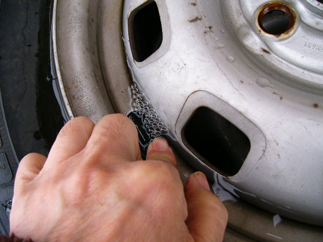 スノータイヤに交換しようと用意したタイヤの一本が空気が抜けていました。エアーを入れてみるとなんとエアーの入れ口の横のほうからしっかりと漏れが確認できました。なんと見事に泡が沢山出ています。なんだか感心してしまいました。