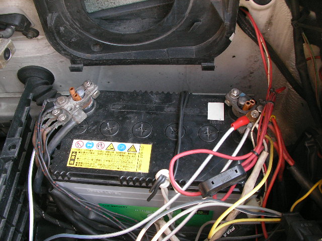 答えはそのスペースに収まれば何でもOKです。一般的には端子が右手前が+だとか-だとか、聞かれますが、私は何でも取り付け可能です。その例をお見せしましょう。二枚目の写真が正規版ですので比べてみてください。よく見てください、端子の太さが違いますが、エアコン用の銅パイプをかなづちで打ち込んで調整してます。端子は全く右左逆ですがくるりと回して正規品だと手前に端子が来るのですが向こう側になってます。何でも対策をすればOKです。