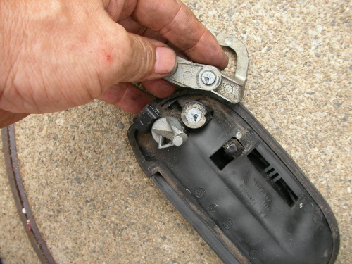 ばらしてみましたら、アルミダイキャストにスが入ってました。13~4年経ってますのでクレームは効かない。たまたまBMWの関係者が訪ねてきていたので聞いてみると、三万円くらいしそうだとのことです。A案、2.2mmのキリで穴を開け、ネジを切って二液性エポキシで接着しビスで締め込むというのが私の案です。霧で穴はあきましたが、写真のようにキリが折れて残ってしまいました。でA案はあっけなく、没です。そこでB案ですが、ひと箱105円で、100円ショップで買ってきてあったボルトセットから近い太さのボルトでネジを切りまして、ぴったし成功、緩み止めも施しました。殆ど成功ですが、ホンの少し動きが悪いのでもう一度ばらし直し、もう一段バラしました。いい頃下限でやめておけばよかったと後悔しましたがもうすでに遅し、腹が減ったので昼飯休憩。で