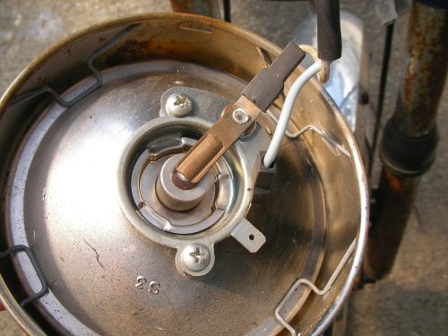 実はメーターワイアーは二台とも切れてました。コミコミで5000円ほどもするのです。そこで直してみようと思いました。外側よりもワイアーがはるかに短かったのでアウターをカットしました。潰れないように、そうしないとワイアーが回ってくれませんから。圧着スリーブの小でカシメました。ダメ元でやればなんでも出来ます。20キロで二速にアップします。やっぱりメーターは見えたほうがいいですね。私が重たいのか40~45キロくらいしか出ませんが、それで十分です。そのくらいでも原付は30キロですから、10~15キロオーバーで捕まってしまいます。実は私はペダル付きのモペットをあと三台持ってます。TOMOSが二台ですから全部で5台です。ダイハツが輸入したフランスのソレックス。これはFFです。前輪にローラーを押し付けて回します。そのままペダルを漕げばエンジンスタート。ローラーを前輪から離せば自転車になります。スピードは自転車にも負けそうですが、街中では車にすぐに追いつきます。これはこれなりに大好きです。次はリトルホンダのP50です。これは二台目です。一度売ってしまいましたが、またほかのが回ってきました。自転車とエンジンの切り替えレバーがあります。それとデコンプがついてまして、エンジンをかけるときはそれで圧縮を抜きペダルを漕いでエンジンをかけます。もう一台もホンダピープルですが、これだけは一度も乗ってません。故障箇所があったからです。もう一台はTOMOS1号です。そのうち動くことでしょう。さて遅くなりましたがTOMOSは、ペダルを逆に回してエンジンをかけます。面白いことに、最初からキーはありません。こんなものを盗んでも目立って仕方ないからプロは盗まないでしょう。またエンジンがかからないと思います。しかしTOMOSは楽しいですよ!!暑い中すったもんだしてなんとかメーターは動きました。やればできる、誰にでも。