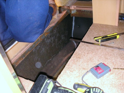 一昨日、キャブコン コルドバンクスを見せていただき、昨日は第一回取り付け会議、さあ今日は実行一回目、後ろのトランクの床をを切り抜いて室外機のスペースを作ります。幅はぎりぎり何とかなりますが高さが足りません。ちょうど同じ幅と高さの段ボールでチェック、これで入るはずです。完全オーダーメイドですから、まさにカット安堵トライです。じっくり、時間をかけて取り付けます。写真はありませんが、室内機の取り付け場所の棚を二つ外しました。