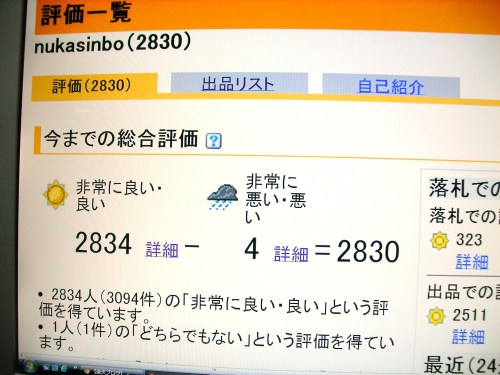 評価はよいに越したことはありませんが、私は今現在こういう評価です。今のところ多少評価の悪い方でも、私にはよい対応をしてくださいました。今日駄目かなーと、多少あきらめかけていた方が出張中だったと即対応してくださいました。それと基本的に入金前に発送することにしています。まだ一つも事故はありません。本当にありがたいことです。