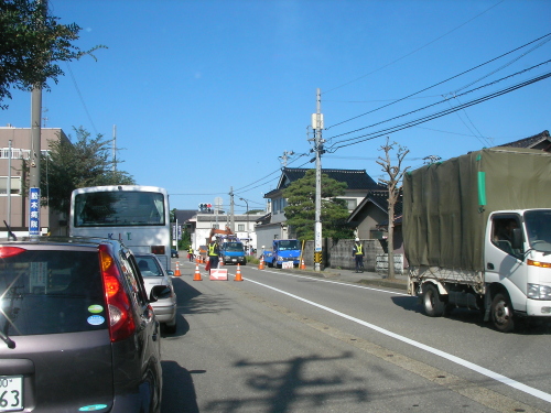 私もガードマンをしたことがあるので、真ん中は実に怖いです。後ろから轢かれます。3回か4回ほど車で突っ込まれたことがあります。その中の一回は相棒がひき逃げで入院しました。人手がない時は仕方ないのですが、この現場は4人のガードマンが見えました。もう一人が逆方向に向けて立つべきです。