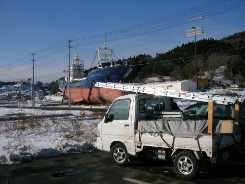 朝一番の仕事を終わり見番目のお宅に向かう途中の上り坂でスリップして上らなくなりましたので、ブレーキを踏みましたら、止まらなくてズルズルと下がる一方。車はあらぬ方向へ横滑り。ガードレールに密着。いろいろ試すも登りなので前へは進まず、ええい、ままよとバックしガードレールに車の左側を沿わせるように下がりましたら、何とか復帰いたしました。ここ大船渡は雪はそんなに降らない代わりに氷の世界です。それと大風、一昨日ははしごを飛ばされ大変でした。屋根に上れば寒さも風も倍増されます。よく生きていますね。ガードレールですが、もしなかりせば、ぽっとんと川の中でした。少なくともずぶぬれは免れませんでした。悪ければ車の下敷きかな?