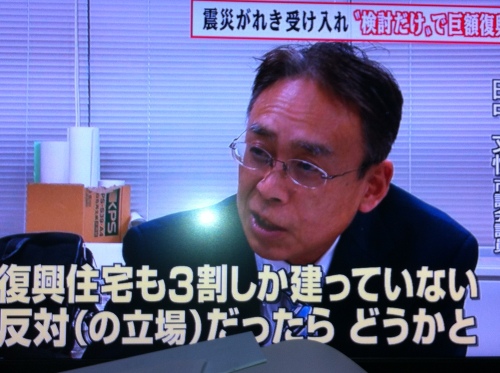 大阪堺市が震災がれきの受け入れを検討しただけで復興予算を86億円ゲットしたというお話です。もし普通に一般予算が通った場合は国から63億円しか出なくて残りの23億円は自前で出さなくてはならない。それが復興予算だとまるまるもらえた。もちろん検討だけはしたのだから返さなくても良い。また返すということは法律に反することとうそぶく堺市の担当者。それにたいして、田中 丈悦, たなか たけよし, 南区, 会派に属さない議員(スタンス明確市民派), 産業環境委員会. は復興住宅もまだ三割しか建ってないからそちらに使うべきであると言っている。そのほか日本全国で同じ検討だけで合計175億円が消えていった。国会のバカどもと官僚は予算を使い切ることこそ我々の仕事である。よく仕事をしたというバロメーターであるという馬鹿な認識。