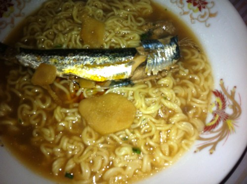 富山湾に大量のいわしが入ってきて漁獲高が7倍以上になったというニュースを聞いた。たまたま安かったので嫁がいわしを買ってきて一日置いてしまったので、生では無理と煮魚にした残りが、一匹余っていたので、早速作ってみました。出前一丁に乗せただけ。まあ、悪くはない、普通に食べました。大船渡さんまラーメンに勝ったかな?