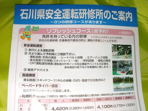 普通車なら車とコースと先生付きで3490円、クルマ持込みでコース借りるだけでも1640円もするので3490円は割安である。福岡出発の準備で積みっぱなしのエアコンを売って来たついでに寄ってきたのだが休みであった。無理を言ってパンフレットを貰ってきた。忙しい時ほどいろいろはかどりますね。今日は沢山のところへ寄ってきました。そうそう帰ってきてから加賀市のモーターを見てあげないといけません。忘れないようにここにかいておきましょう。