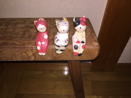 私が勉強(この所はサボリ気味)しているむつう整体ですが、自分でも多少は出来るのですが自分の枠を超えてしまうと先生に見てもらわなくてはいけません。はやりのグルコサミンなどのサプリはあんまり摂りたくはないのですがどうしてもダメならしかたがないかなとも考えてました。整体は自分でしたから良いかなと軽く考えてましたがその上があるのをすっかり忘れていました。朝、早速予約の電話をかけましたが三時半にしか予約は取れませんでした。やはり、調子の悪い人が大勢いるのですね。一時間半はかかるので即だと間に合いませんが少し時間が有りますから他へ回ります。不思議な事に予約の電話をしただけで膝が少し楽になりました。又整体院につくと車から出ての歩行が全く違いました。又々不思議な事にびっこを引かなくなっていました。去年から来てないので随分悪くなっていたようです。本当は一年に一度か二度勉強を兼ねて体の姿勢をもらうほうが良いと思います。どんな治療かというと二時間寝ているだけなのですが、治療法は日進月歩なので私の知らないものがたくさんありました。物凄く顔を歪めて苦しんでいる方もいました。幸い私はそんなに辛くはありませんが、今回は早く終わって欲しい。最後の方は嫌になってしまいました。苦しいのは直している、良くなっている証なのですがもう二度と嫌だと言ってやめる方もいます。縁がないのだから仕方ありませんね。コレはいろんなことにも言えると思います。さて治療がやっと終わって私の腰が悪い事が指摘されました。全く腰には違和感はなかったのですが、腰が悪いと膝に来るのは知っていましたので成る程勉強になりました。さてその後、恐竜の制作現場の下見に行ってまいりました。不思議な事に整体院の奥様と恐竜の制作現場の奥様は以前同じ職場にいたとのこと。全てはつながっているのですね。何故、私がほんの少しですが整体ができるようになったのかは、簡単に言うとお医者さんがヤブだったからです。西洋医学では異常なしですが私には異常はあるのでした。皆様も異常があれば一度むつう整体に行って見ることをおすすめします。この子たちが玄関で送り迎えをしてくれます。