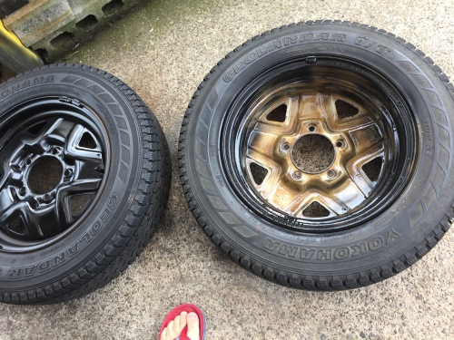 1本あたり1312円ですからかなり安いのです。表だけシャーシーブラック?のようなものを塗ってありますが裏は無しなので、サビを取ってから特殊錆止めを施して、シャーシーブラックを塗りました。こんなにぶっといマッドアンドスノーがついてたのです。ただでさえ小回りがきかないのですが内側があたってしまうのでノーマルのスノーを前にだけはめてみましたら黒はなんだか合わない。そこで白を塗って見ますと黒が溶けて出てきてしまいました。ここは亜鉛どぶ付けのスプレー仕上げ。ここはシャーシーブラック仕上げ。で。こんなんなりました。反対側も。で、出来上がりがこれ。鉄ホイールながら太いタイヤにアルミよりも1キロくらい軽いので合計4キロ軽くなって、明らかに走りが軽いです。雪よ何時でも来い。