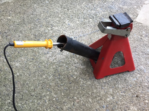 86オーナーさんに銀線ジムニーを試乗していただきほんとうに面白い車です。怖くなってしまいました。凄いここまでだとは思わなかった。びっくりした。等のコメントを貰ったのですが、少しもの足りず、買った時に付いてた足場単管マフラーに付け替えてみました。まず低速トルクが増えて乗りやすくなり、レスポンスもアップしました。しかし後車軸に当たってしまいそうなので、少し曲げなくてはなりません。外形48.6mm 2.4m厚 内径43.8mm の大変丈夫な足場単管で作ってあったので、曲がらないということはわかっていたのですが、少しでも曲がって欲しいということで無駄な努力をしてみました。後車軸を支点にしてパンタグラフジャッキで押し下げます。今度は真ん中をジャッキで押し上げます。1cmだけ曲がりました。これだけ足場単管は丈夫でしかも安いのです。