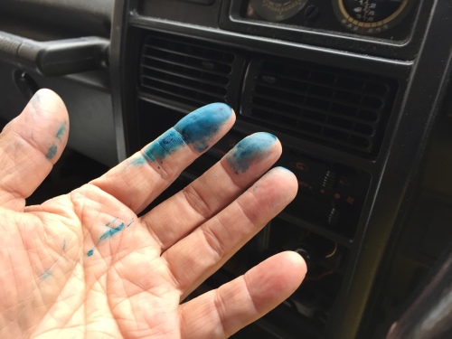 ということは知らない間に殺してしまったのか?私のジムニーJA11Ⅱのヒーターダクトを修理していたら、ベットリ手に付いた。丁度血液のような粘度である。正体不明だが、ひょっとすると不凍液が漏れたものかもしれない。奥のほうを覗いてゴソゴソやっていたらポロッとビスが落ちてきた。このジムニーはエアコンのような顔をしているのだが、クーラーなのでレバーを内気循環に切り替えないとクーラーが動かないのだ。松戸市~豊川市~三木市 遠征の途中でレバーが動かなくなりエアコンが効かなくなってしまい、レバーを無理やり動かしていたら、完全ではないが辛うじてレバーが内気循環側に切り替わったのだった。何時かじっくりフロントのメーターパネルからグローブボック全て取っ払いどんな仕組みになっているかを確認せねばと思っていました。このビスが何処からか外れて邪魔をしてたのか、それとも製造時に紛れ込んでいたのかもしれない。おかげさまで完璧に治ってしまいました。