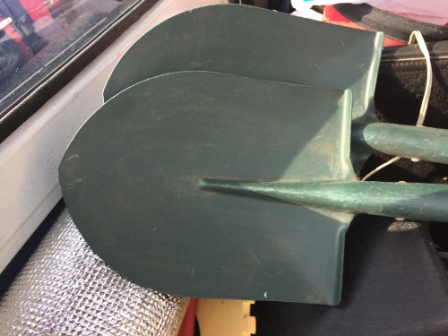 スコップの原点とも言える剣スコ、これがなければ話にはなりません。スコップとはとにかく掘り起こすことです。さていくらかといえば、税込みでも615円ですから、残りの二本買いました。これで一生どころか、捨てなければ三代は使えます。今除雪に主に使っているスコップは父からの遺産であります。今日このごろのプラスチック製のスコップ類は数年で壊れてしまいます。今は損得ではなく手軽なものが売れるのでしょうね。