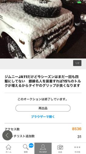 タイトルは ジムニーJA11だけど今シーズンはまだ一回も四駆にしてない 銀線名人を装着すれば15%のトルクが増えるからタイヤのグリップが良くなりますなんかピンとこないタイトルですが人気があるので仕方有りません。何かが良かったのでしょう。質問が3つ来てました。Q質問1何を売ろうとしているのですか? 「車?」「部品?」よくわかりません。A 回答 どうもすみません。 今最も効果のあるチューニングです。 アーシングは効果がないと言われていますが、唯一効果のあるアーシングと吸気と排気のアダプターを現場で作って装着します。 今それが出来るのは私だけではないでしょうか? 買って頂ければその全てをお教え出来ます。 熱心な方なら、2台目からはご自分で取り付けできるかもしれませんよ。Q質問2 当方マフラーアースをしてますが、それ以上の効果ありますか?A 回答 勿論です。わたしのあーすだけでも15%のとるくあっぷがあります。 逆に質問したいのですがマフラーアースはどういう効果がありましたか?Q質問3 前向きに検討しているのですが、何故トルクが増えるとタイヤのグリップが良くなるのでしょうか。A 回答 御質問有難うございます。雪道に関してですがローで発進すると滑ってしまうので2速発進や3速発進なら滑りにくくなりますが、普通ならエンストしてしまいます。銀線名人を取り付けるとそれが可能になります。 だんだん分かりにくくなりますね。よろしければ電話かメールで説明しますね。残念ながらこれだけです。電話があれば詳しくお答えできるのに。