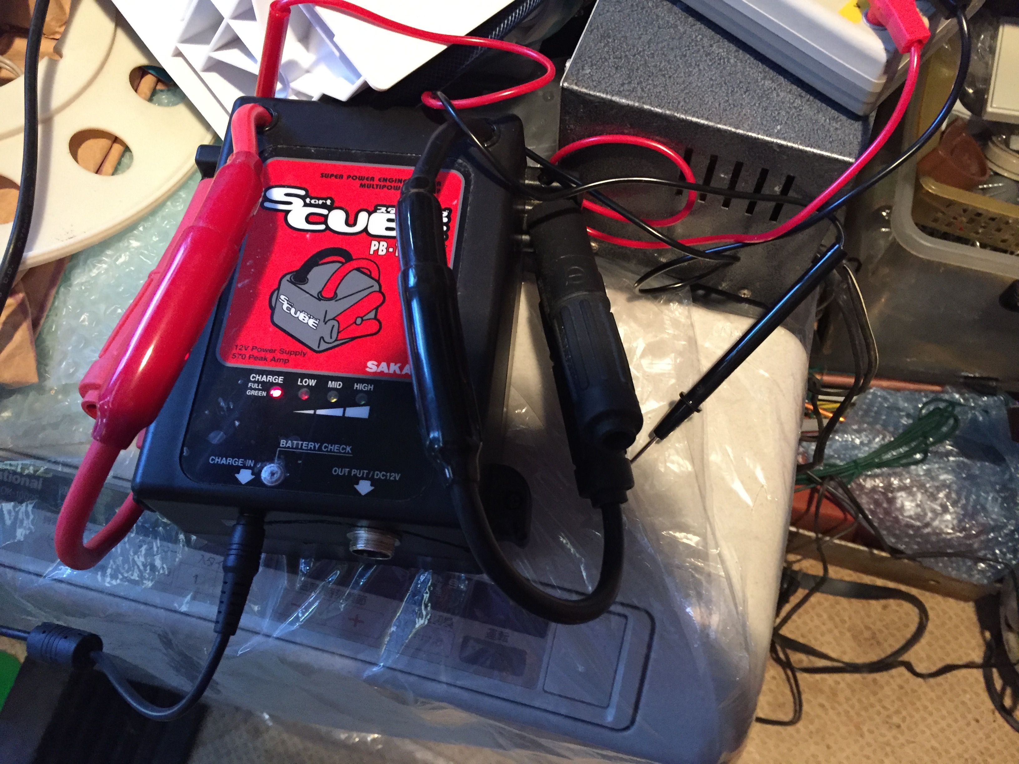 1Aにも満たないアダプターで数時間充電したつもりが全く入らない。3.5Aの先が短くて届かないのを加工する。さて本体の穴を大きくするかプラグのプラスチック部分を削るか?後者にしてみた。入った。インジケーターは充電中の赤の点滅ではなく充電済みの緑ランプ点灯。チョット違うが仕方がない。4時間充電してみた。11.77Vまで上がった。次に後1時間半で12Vくらいまで上がった。1Aの充電器だと全く空なら24時間かかるので3.5Aなら1/3くらいの7~8時間。後2時間位でいいだろう。満充電でなくても使えれば、生き返れば良しとしよう。