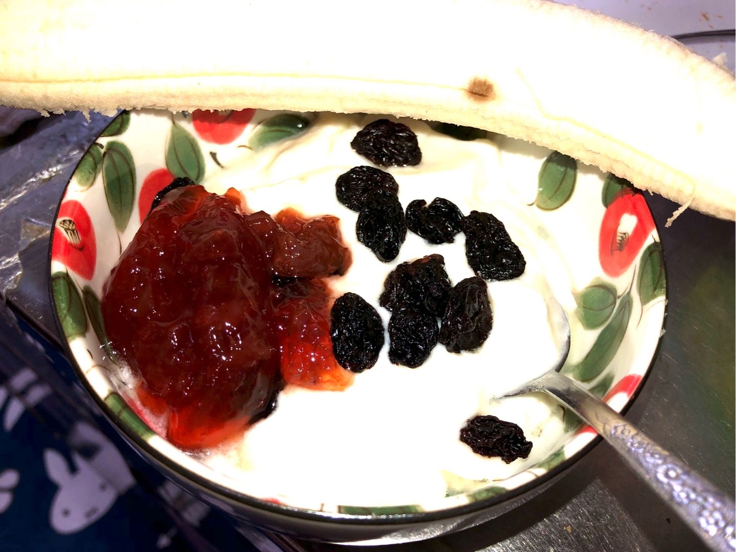 カリフォルニアのレーズンとメキシコのバナナとブルガリアの苺ジャムとブルガリアでないヨーグルト さっきヨーグルトを買ってきたのはこの為でした。