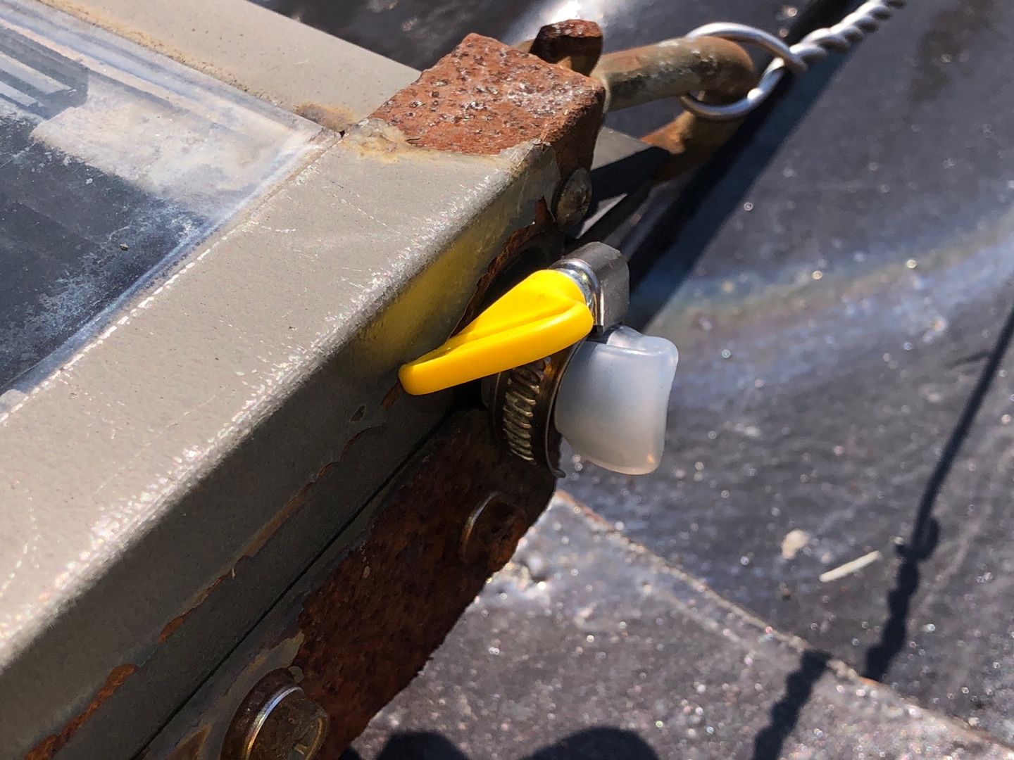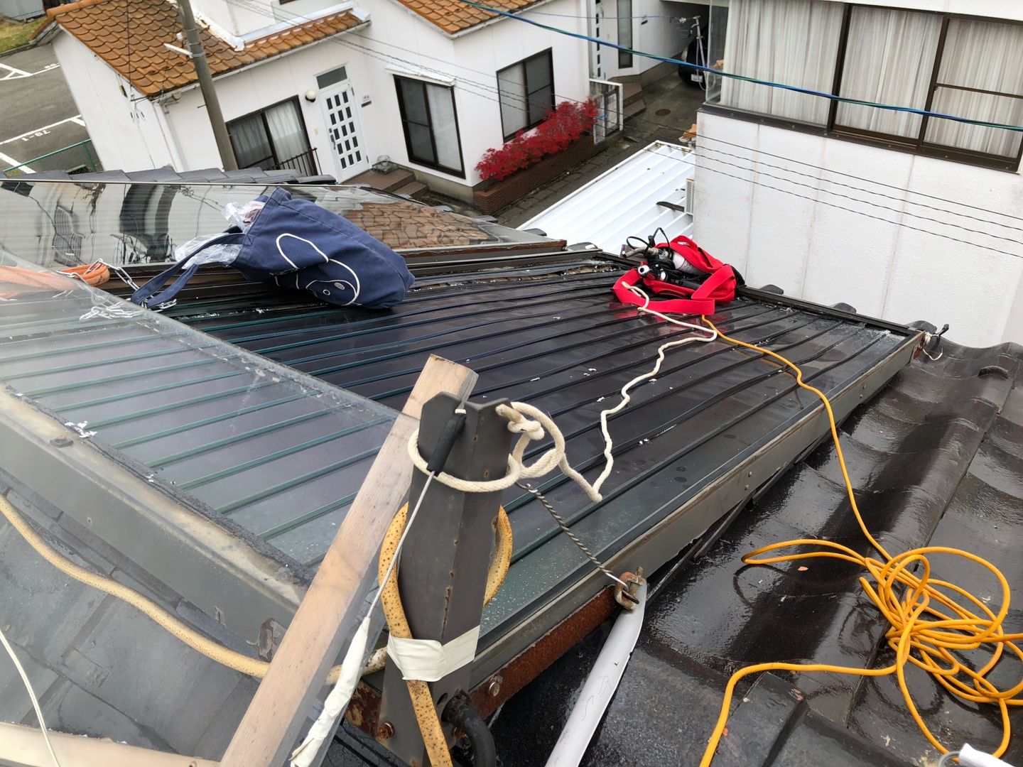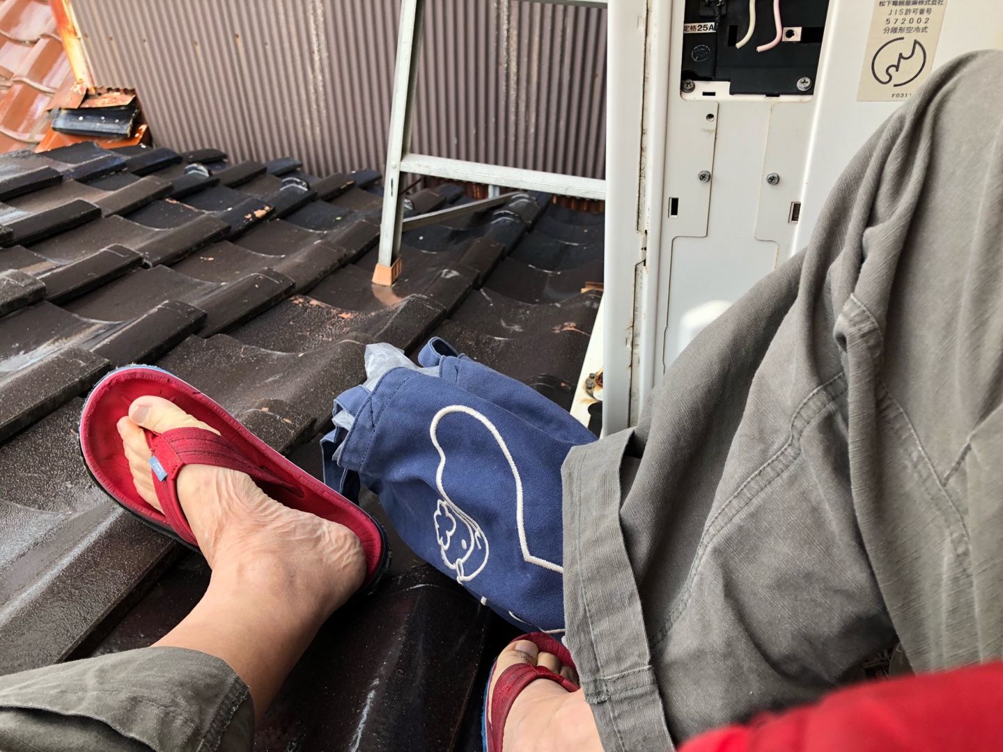 私の目の性能がよくないので鉄だと思っていたのですが胴でした。非常に足場が悪いので緊張と怖さで足がガクガクしています。屋根の先の方は一般的に危険です。瓦も下地もグラグラですから、落ちても不思議ではありません。ああ怖!!こんなに大きな穴でした。チョチョイとペンチで叩いて少し小さくします。何度も拭いたのですが不凍液ですので沁みてきます。エポキシで塞いだつもりですが上手くくっついてくれるかな?しばらく時間を置いてからチェックします。他に鉄セメントも準備してありますのでダメならそれも試します。ハンダで塞ぐのもありです。