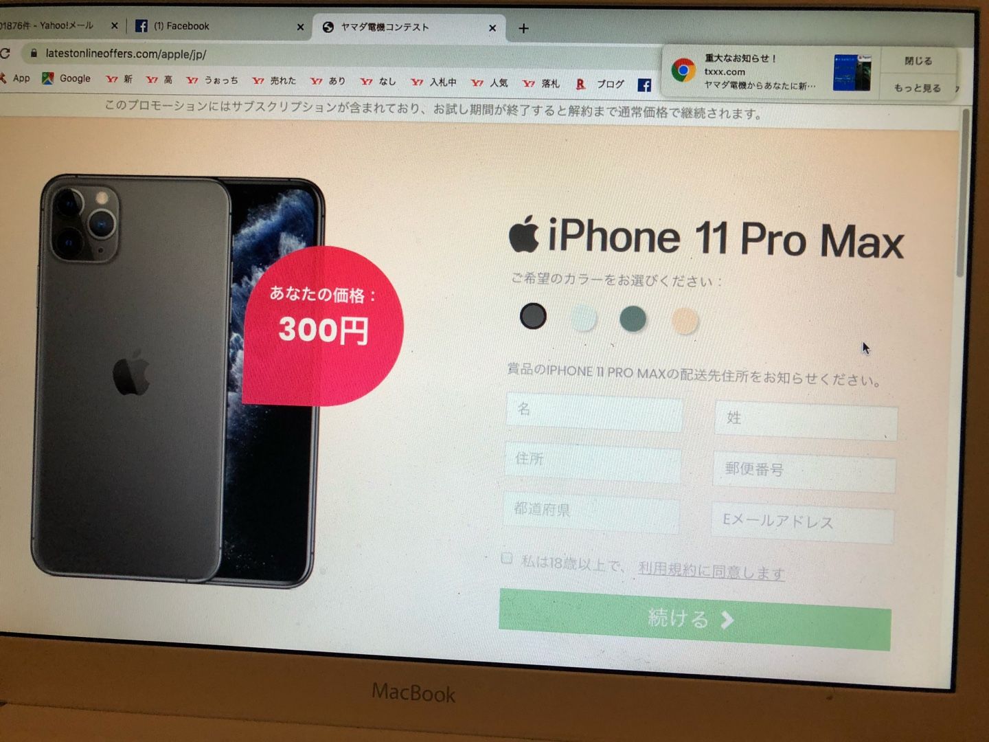 あなたのマックはウィルスに感染してます。と言うようなのが20くらいこれでもかこれでもかと来ています。その中に10分の1ほどヤマダ電機からの重要なお知らせというのが来てます。あまりに煩いのでクリックして見ましたら、アンケートを三つくらいして山田に否定的な答えを書いたにもかかわらず16万円を超える価格の愛フォンが当たりました。さあご希望のカラーを選んで配送先の住所をお知らせください。あなたの価格三百円????三百円くらいなら払ってもいいかな?でも月々でっかいお金がかかるのは嫌だな?まるでジャパネットみたいだ。ジャパネットなら百円で月々六千円くらい。まあこれも・・・・・・みたいなものだが・・・ここで最寄りのヤマダ電機へ電話をして見ました。?????でしたが、ネットで検索してくれて詐欺らしいです。という答えがすぐに出て来ました。後で私もネットで検索して見ましたがいろんなタイプがあるようです。詐欺師も頑張ってますね。阿部ちゃんももっと頑張れよ!!