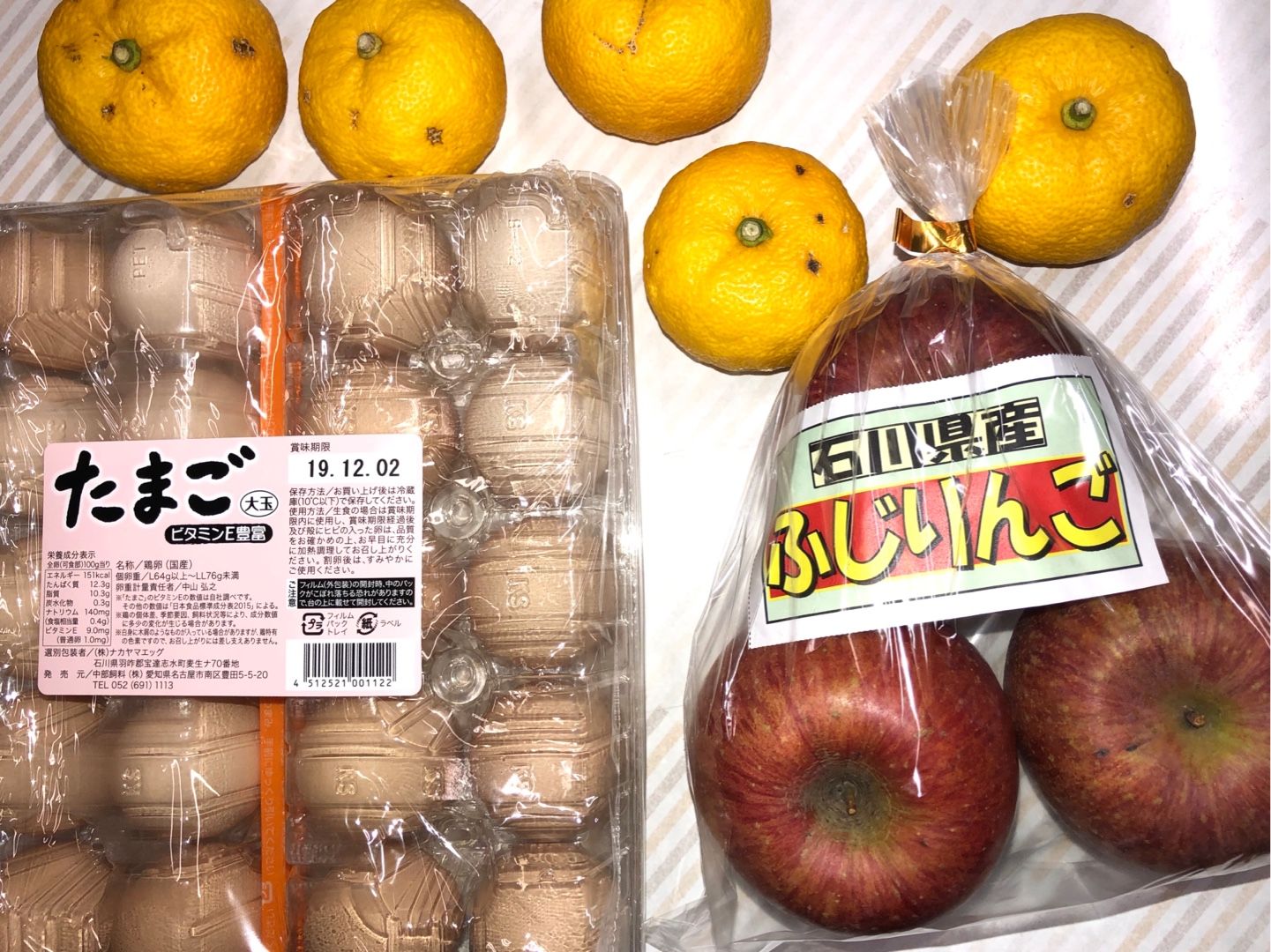 ふくろ三つ分頂きました。りんごとゆずは在庫はあったのですが、冷蔵庫を開けると卵は0でした。神様は見てたのかな?なんて思いました。あら、みてたのね!!
