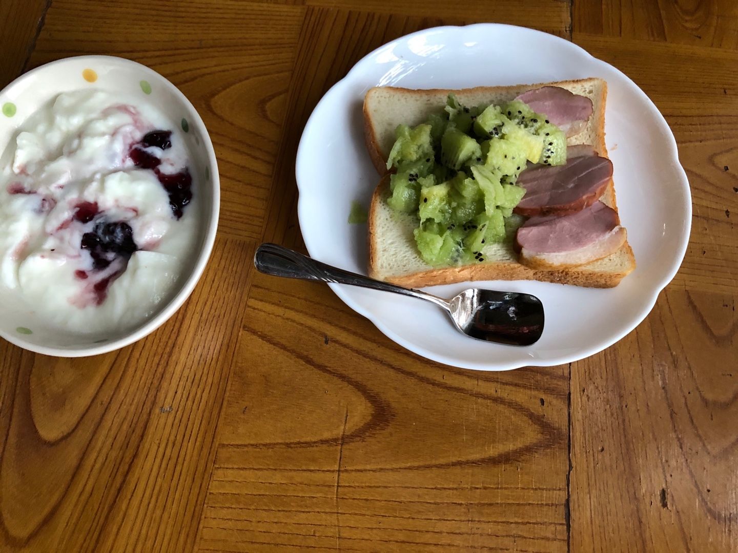 スーパーの8枚切の食パンに娘の残り物の鴨のハムに自家農園(嫁の母親)の有機栽培のキウイに金沢のヨーグルトにエジプトのブルーベリージャムにフランスの粒マスタードをつけて食べてる私。 飲み物は鉄瓶で入れた日本茶。