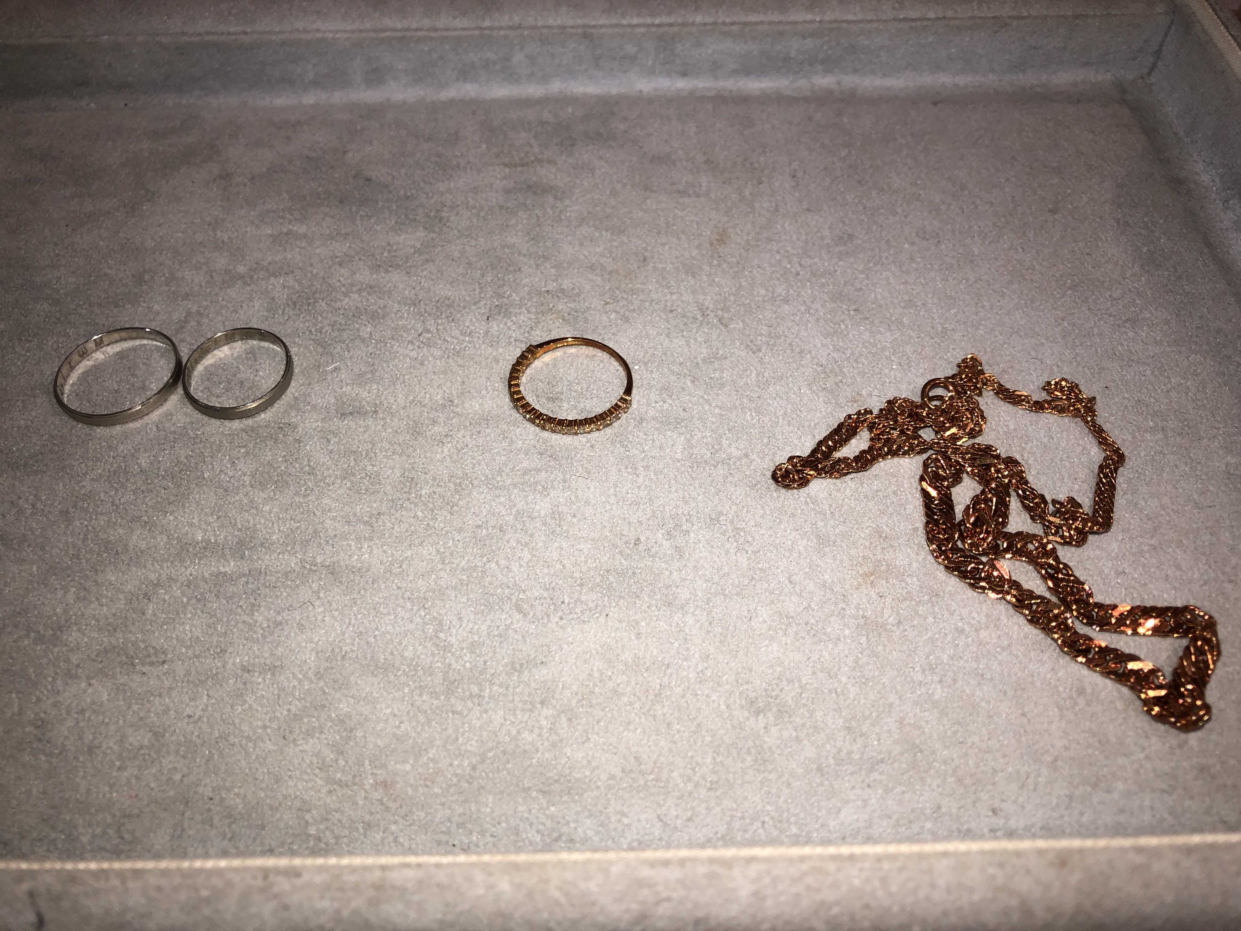 二つで七千五百円でした?ついでにおばさんから貰った指輪とネックレスも?左端が結婚指輪。真ん中が四千八百円。右のネックレスが4万円でした。結婚指輪は40年ほど前に6万円か7万円ほどしたと思われます。私の知り合いの質屋さんへ行きました。いろいろ話を聞くとコマーシャルしてる有名どこだとこの半分くらいかな?なんて言ってました。満足です。おばさんありがとうございます。ついでですが?この後銭湯で計った私の重さは77、7キロでした。