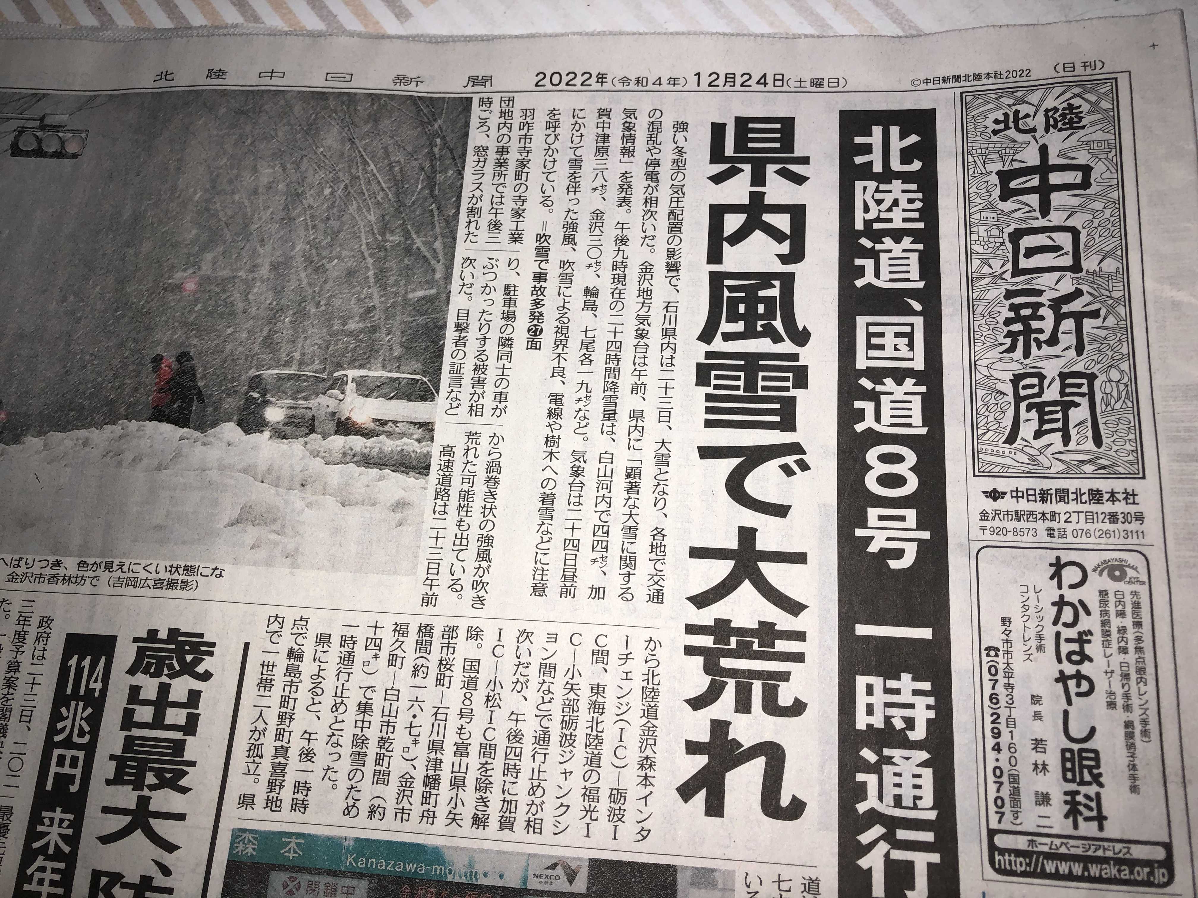 昨日は大変でした!!四本のタイヤの線路が出来て車はハンドルも効かず 駐車してある車に ぶつかりそうになってました。昨日の新聞です!!昨日の22時39分 除雪車が二台で何時間も地面だし!!写真は半分だけ地面が出せたところ!!今日の北陸中日新聞!!この山を少しずつ小さくしなければなりませぬ!!