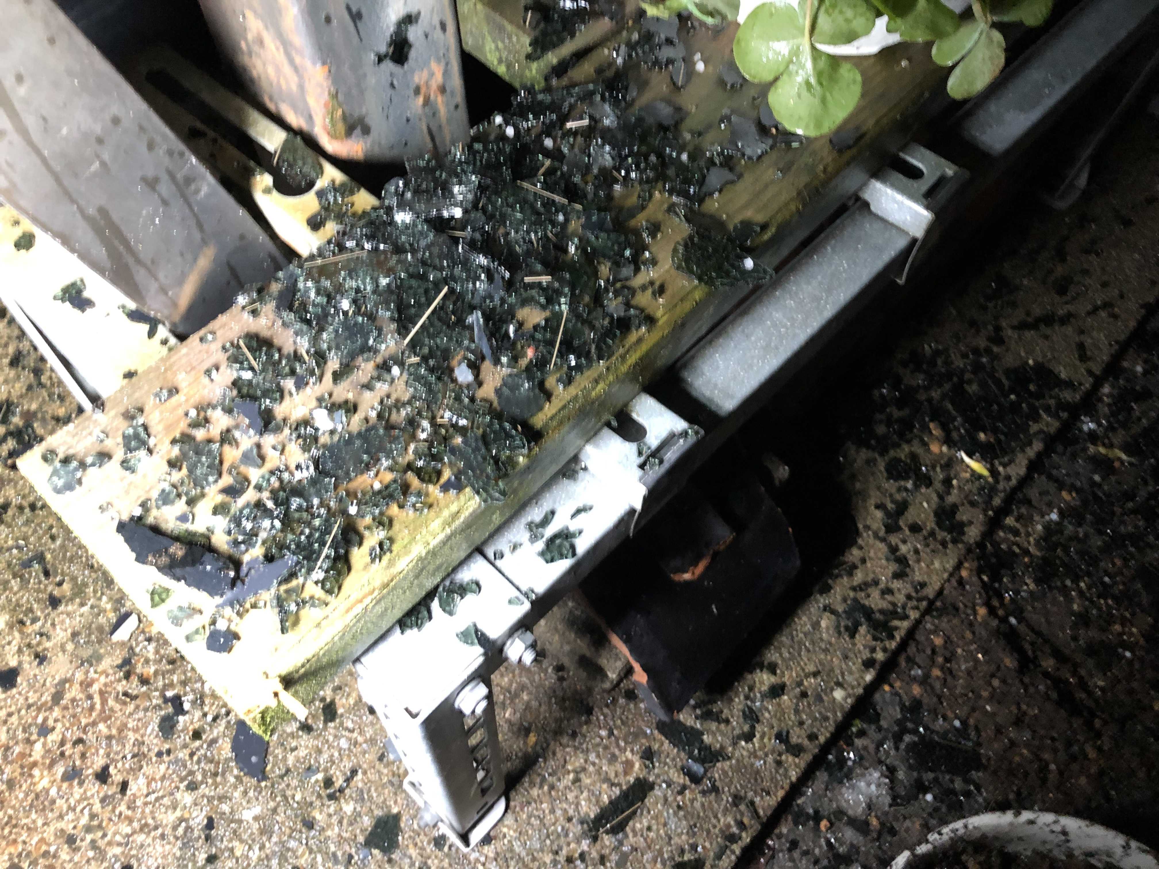 昨晩 植木鉢が二つこぼれていました?よくよく見ると?黒いガラスが割れていました?暗いのでライトを当ててみると?私が想像するに?どうも車が当て逃げしたような?バックした時に車のウインドウが?割れたのか?で翌日箒とダイソンで掃除しましたが?雨で重くてうまく処理できません??
