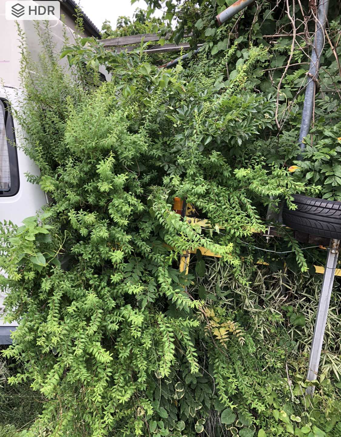 左にうっすらと見えるのがキャンピングカーだが自然の力は私より強い?おとなりの奥さんがうちの木が隣へ侵食しているとおっしゃるので切ってくださいとお願いした?近くに沢山のお店が出来て私の別宅の住宅群はお店のおまけのようになってしまった。そのお店を二軒ほど見学してきた。そこで二人の赤ちゃんに会った。その後も某所で若い二人に私のボンネットにタイヤのついたジムニーがかっこいいと褒めてもらった。