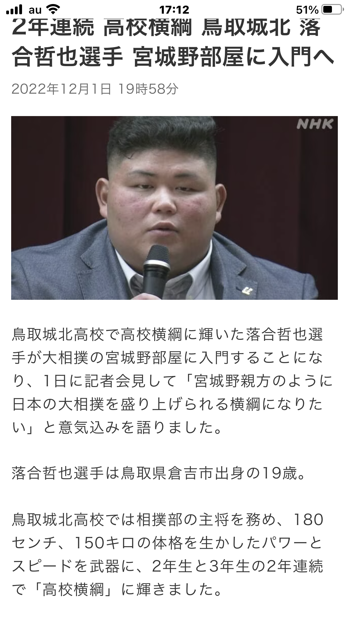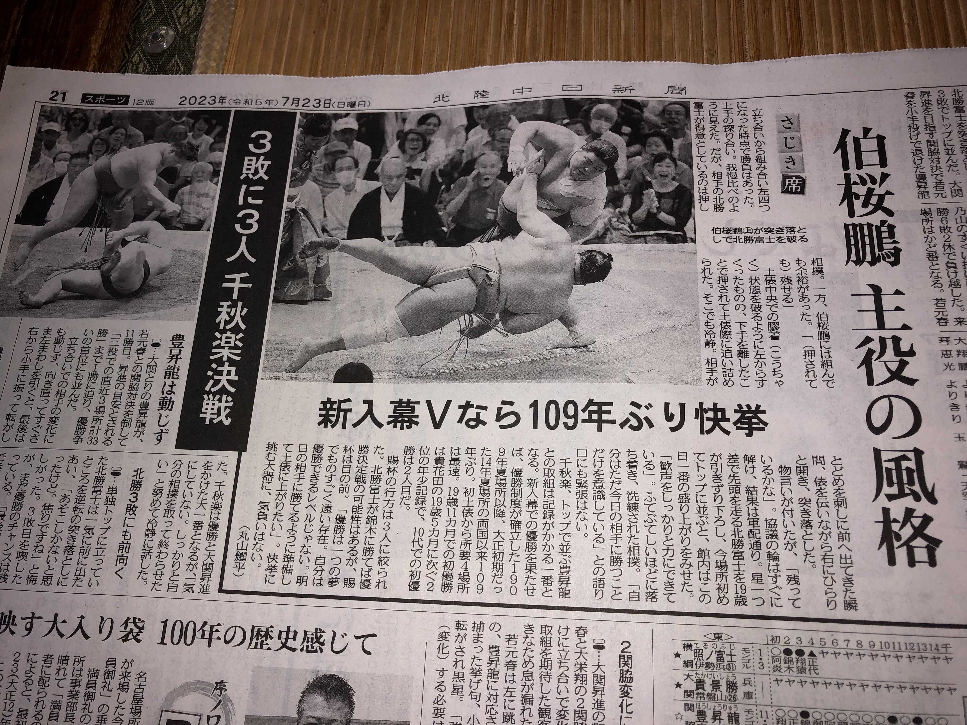 私は落合改め伯桜鵬に勝ってほしかったのだが?まあ、あと何度もチャンスはあるし、絶対に横砂になるだろうと予想したしこ名だと思う。石川県津幡出身の大の里とは大違い!!そう言う風に私には見える!!お辞儀も丁寧だし、相撲も上手い。実に好感が持てる。さて新大関だが優勝が決まって土俵を下りたとたんに涙、そして一番目には師匠に報告し二番目にはおじさんに報告すると言った。この涙や笑顔で人気はずんずん上がるだろう。残念ながら私の押してる炎鵬や照強が調子悪いがその代りにこの伯桜鵬や新横関、それに宇良が頑張ってくれるだろう。私の好き嫌いのお話でした。