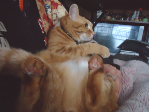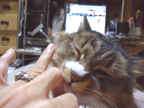 シャッターチャンスを逃しましたが、ちゅんこはいつもこうしてしつこくしつっっこく私の手を毛繕いしてくれます。痛いです。そんなに毛深くないはずです。病院は疲れました。もう何を言われても首を上下左右にふるだけ。最後に、「じゃあ来週また同じ時間で」で、2週間後にしてくれと言ったら、「今はうるさくて2週間出し続けると指導が入るから10日分でいいかな?」って。おkしてバイバイ。抗鬱剤以外は少々ストックがあるので、3.11後の12日あたりでいっかな。今日からまた、獣医師を中心とした公益保護が入ります。前回の教訓を活かせないバカどもめ。おまいらの保護数と、年末に保護団体さんに許可出したほんのわずかな期間の保護数、比べてみろや。今回用意した捕獲器の数はまずまずだけど、10人かそこらでどれだけ成果出せるのやら。いくつかの団体さんが、支援金や支援物資送った人の名前を、イニシャルとかじゃなくて、ほぼ分かる状態で出してる。やめて。Z区に住んでると、×町の×です、で漢字分かってもらえるので全く特殊じゃないと思っていた苗字、それほど多くないということを知った。ただでさえ己の偽善っぷりに嫌気がさしているのに、さらに偽善っぽい。そして、応援してます!とか言いながら、みんな全然寄付してないんだという事も分かった。私はちょっとやりすぎた。2月、支援金と支援物資で10万越してた。だって、2月の雪の中、現地入りしてくださる方少ないんだもの。いついつ行きますって告知されたら、バンバン送っちゃうじゃない。3月は公益終わるまではほとんど入らないだろうから、支援金を少なめ~にばらまくだけにしよう。この子さ、しっぽがフッサーラじゃなかったら、うーちゃんかと思う。離ればなれになったら探せる自信ない。迷子札だけじゃ不十分だろうか。やっぱマイクロチップ入れるべきだろうか。シンはあの体格だからひょいっと済んだけど、猫、麻酔使ってほしくないんだ。局所麻酔とか表面麻酔とかで対応可なんだろか。ちょっとよく考える。ちなみに今、イエモンの全アルバムとシングルカップリングを、すっごい小さい音でかけて聞いている。以前のような昂揚感はないけど、また音楽に興味を示せることを願って。
