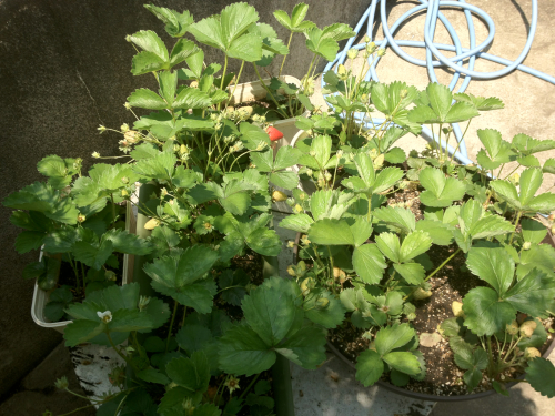 去年買ったイチゴが今年たくさんの実をつけました。甘いのすっぱいのいろいろあるみたいですが、豊作です。