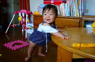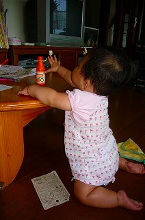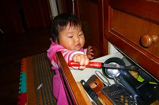 伝わり歩きもお手のもの。家中行きたい所にハイハイで行きます。階段の柵が開いているのを発見すれば、2階に行きファックスを悪戯。ビデオのテープを入れるところに自分の手を入れて抜けなくなって大泣き。引き出しや戸棚は勝手に開けて中のものを引っ張り出して散乱状態。テーブルやソファーに登ってその上で元気に屈伸運動、、、。自由奔放に家中で遊びまわっています。毎日、何回も何回も開けて中の物を出してあそぶ台所の引き出し。中には、おたま、泡だて器、フライ返しなどが入っています。ハルルが小さかった頃も同じようによくお玉を手に持って遊んでいました。片付けは大変なのですが、危なくなければ遊びたいように遊ばせています。