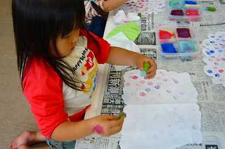 ハルルが通っている育児サークルで、今日はオクラを使ってスタンプ遊びをしました。紙を花形に切って、オクラでスタンプします。かわいい アジサイになりました。みんなの作品。