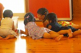 幼稚園に行っているお友達が夏休みに入ってから、毎週火曜日と金曜日に場所を決めて遊んでいます。今日は幼稚園のいちごの部屋に行きました。このいちごの部屋は、近所の幼稚園が、未就園児の為に開放している部屋で誰でも遊ぶ事が出来るのです。おもちゃもあるし、天気次第では園庭でも遊べます。お友達のお母さんがドミノ倒しを始めました。みんな、並べるのに夢中になっています。ハルルも、神経を指先に集中して、、、外が少し曇っていたので、今日は園庭でも遊びました。いつもは怖がっていた遊具で、今日は遊ぶ事が出来ました。