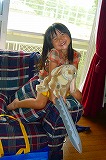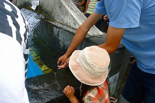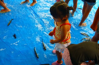 今日は、公民館でニジマスのつかみ取りをしました。前の夜から魚を獲る真似をしていてやる気満々です。水着を着て、小学生のお兄ちゃんお姉ちゃんに混じってプールに入りました。魚は獲れるかな、、、思ったより、泳ぐスピードが早く、手が出ません。しかも、泳いでいる魚なんて触るの初めてでちょっと腰が引けてます。えいっ。狙いを定めて、勇気を出して、、、ママ~ヌルヌルしてるぅ~プールの中には、ザリガニと亀もいて、お友達がザリガニを捕まえ始めました。りぷうちゃん、、すごいね、、、ハルルは、ちょっと怖いよ~はるるちゃんママ見て~ザリガニ捕まえたよ。虹鱒のつかみ取りの後は、魚をさばいてみんなで頂きました。この日のご飯は、竹筒のなかにお米を入れて炊いた竹飯。ほんのり竹の香りがしたような、、、魚はさすがに新鮮。とても美味しかったです。